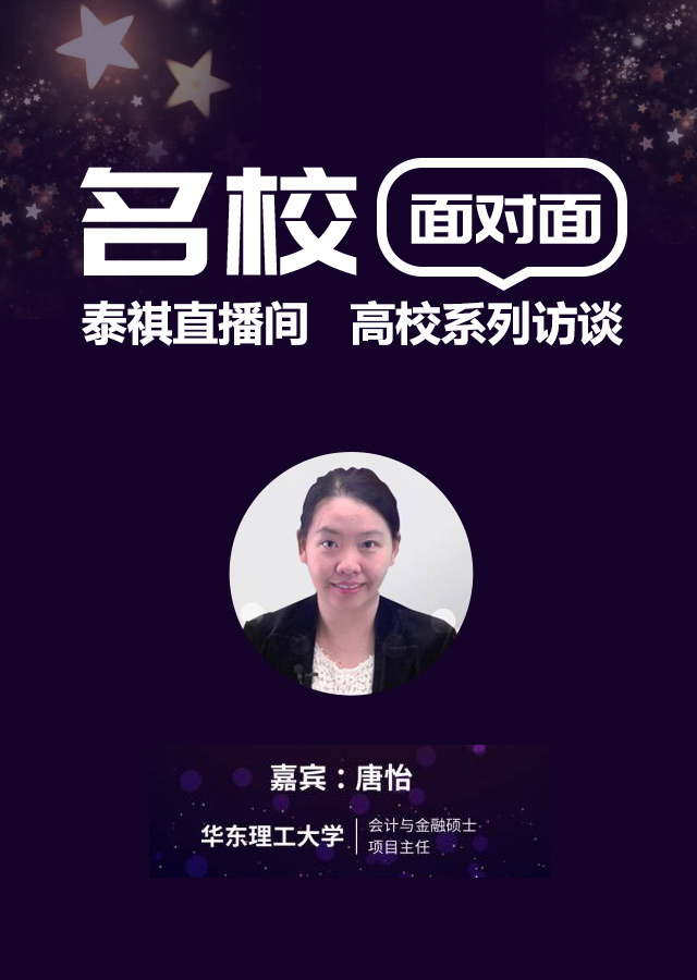 主持人:泰祺直播间名校面对面,各位备考专业硕士的同学大家好,欢迎来到泰祺直播间,我是节目主持人,泰祺教育的倪维然老师。今天来到泰祺直播间的高校嘉宾是华东理工大学商学院会计硕士和金融硕士项目主任唐怡老师,请唐老师给大家打个招呼吧。